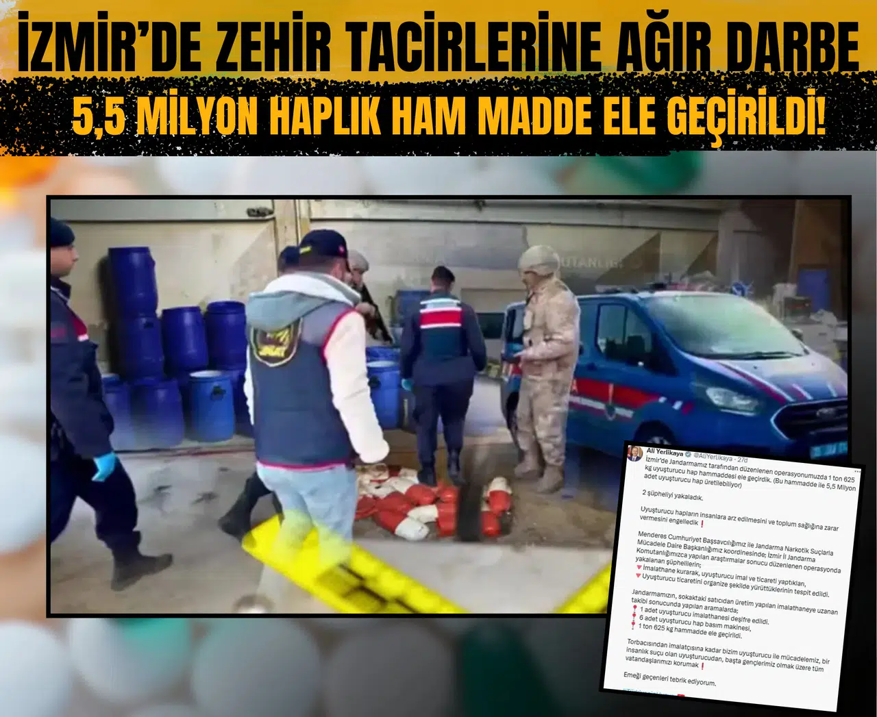 Bakan Yerlikaya, sosyal medya hesabından yaptığı açıklamada, ele geçirilen 1 ton 625 kilogram uyuşturucu hap ham maddesiyle yaklaşık 5,5 milyon adet uyuşturucu hap üretilebileceğinin değerlendirildiğini belirtti. Operasyon kapsamında 2 şüphelinin gözaltına alındığını da kamuoyuyla paylaştı.