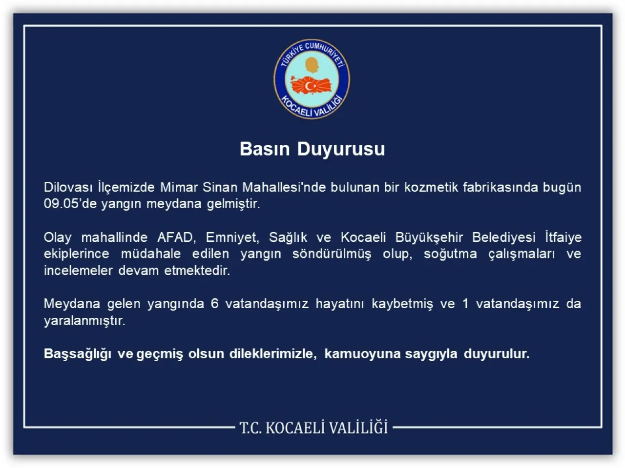 Vali İlhami Aktaş, Dilovası'nda çıkan yangının söndürüldüğünü belirterek, olayda 6 kişinin hayatını kaybettiğini bildirdi.