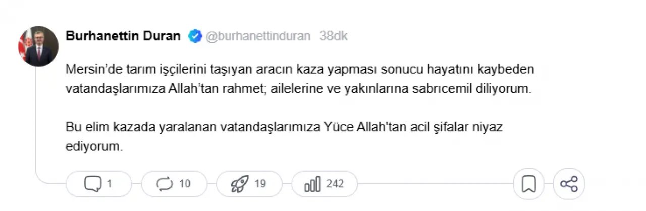 Duran, sosyal medya hesabından yaptığı paylaşımda, “Mersin’de tarım işçilerini taşıyan aracın kaza yapması sonucu hayatını kaybeden vatandaşlarımıza Allah’tan rahmet, ailelerine ve yakınlarına başsağlığı diliyorum. Kazada yaralananlara ise acil şifalar temenni ediyorum” ifadelerine yer verdi.