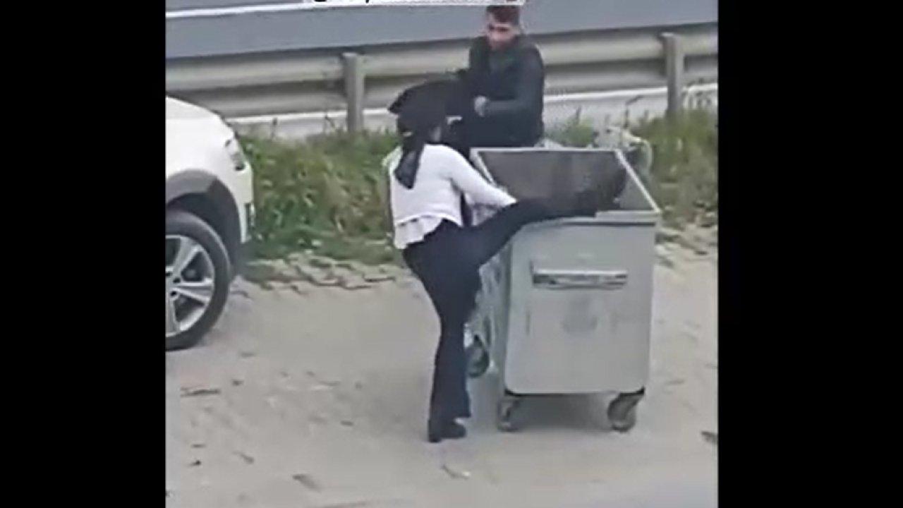 Yanındaki adam tarafından çöp kutusuna girmesi engellenen ve ayakta durmakta zorluk çektiği görülen kadın daha sonra bir araya yaslandı. Ancak dengesini kaybederek yeniden yere düştü.