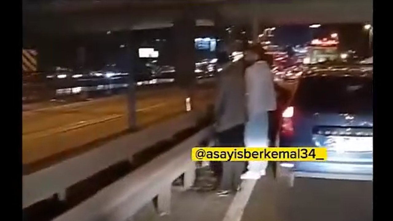 Olay, en sol şeritte ilerleyen bir aracın bir anda yolun ortasında durmasıyla ortaya çıktı. Araçtan inen iki kişi E5’in ortasında bir anda yol kenarına tuvaletlerini yapmaya başladı.