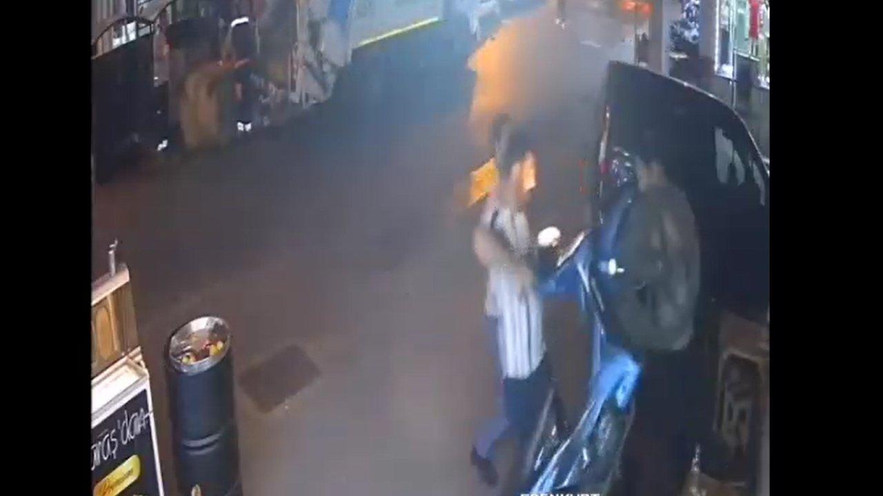 Bir anda büyük panik yaşanırken, kaldırım kenarında oturan kişi motorun altında kalmaktan son anda kurtuldu.