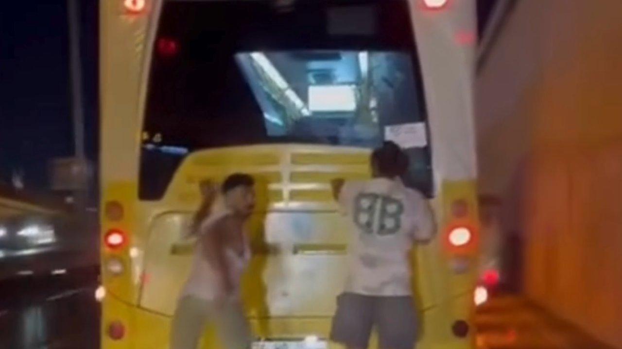 İki patenli genç, İETT otobüsünün arkasında ilerleyen bir sürücünün cep telefonu kamerasıyla kendilerini kaydettiğini fark etmesiyle yolda ilginç hareketler sergiledi.