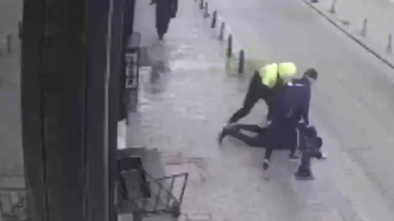 O anlarda saldırgan, yumruk atarak gasp edeceği kişiyi yere savurdu. Yerde olan adam, güçlükle esnafın yardımıyla kaldırılırken gasp anları ise mahalledeki bir iş yerinin güvenlik kamerasına saniye saniye yansıdı.