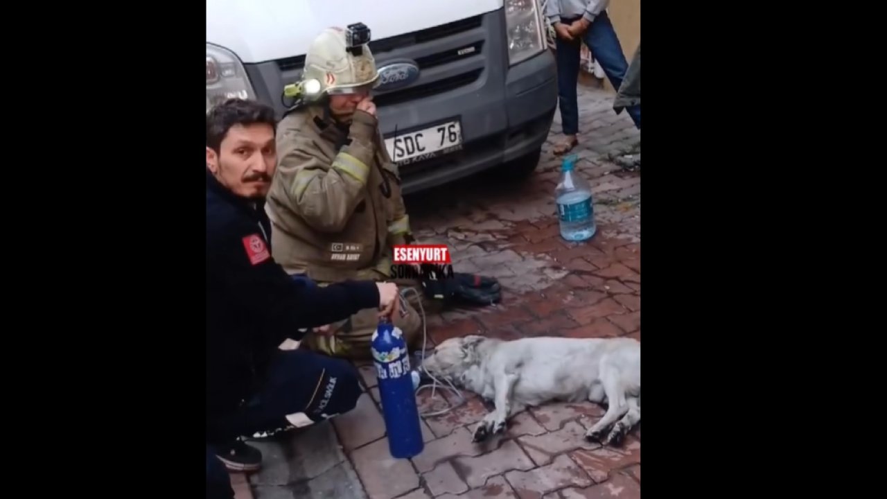 Yerde yatan ve nefes almakta zorlanan köpeğe oksijen maskesi takıldığı görülürken, kedilere ise ambulansta müdahale edildi.