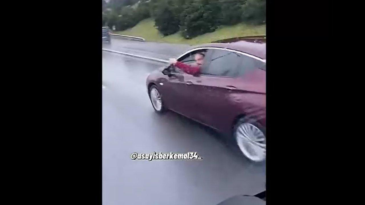 Daha sonra sağ şeride geçen araç sürücüsü, bu kez el kol hareketleriyle otobüs şoförüne bağırıp çağırmaya devam etti.