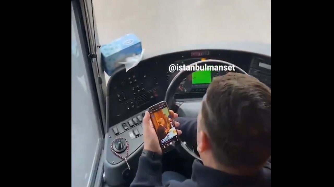 Otobüste bulunan bir yolcu tarafından anbean kaydedilen görüntülerde, yol yerine elinde tuttuğu telefonda yer alan videolara bakan bir sürücü görülüyor.