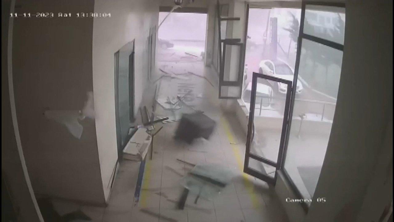 Küçükçekmece'de şiddetli fırtına, otomobil bakım servisinin cam bölmesini yerinden söktü, bir çalışanı da savurup yaralanmasına neden oldu. O anlar, iş yerinin güvenlik kamerasına yansıdı.