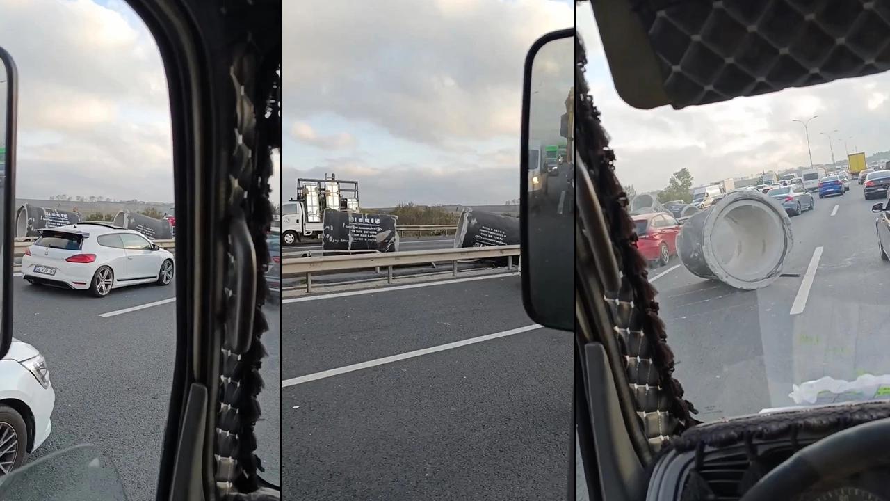 Çatalca TEM Otoyolunda hızla ilerleyen TIR, emniyet şeridinde lastik değiştiren kamyonetle, kamyonet sürücüsüne yardımcı olmak isteyen otomobili son anda fark etti. Ani manevra yapan TIR'ın taşıdığı beton borular yola savruldu. Facia ucuz atlatılırken, beton borulara çarpan bir otomobil sürücüsü hafif yaralı olarak hastaneye kaldırıldı.