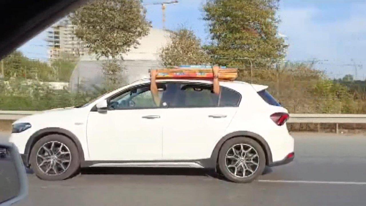 Fatih Topkapı'da seyir halindeki bir otomobilin tavanında yük taşındığı anlar trafikte ilerleyen sürücülerin cep telefonu kamerasına yansıdı. Yoğun trafikte ilerleyen otomobilin tavanındaki eşyayı, içerideki 4 kişinin ellerini camdan dışarı çıkararak tuttukları görüldü.