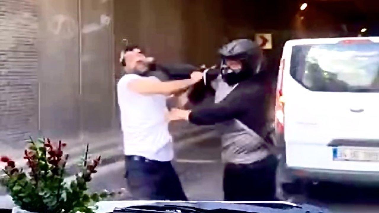 İstanbul Avcılar'da trafikte tartışan motosikletliyle hafif ticari araç sürücü arasındaki ters yön tartışması kavgaya dönüştü. Araçtan inen sürücü ile motosikletli tekme tokat birbirine saldırdı. Kemerin de kullanıldığı kavga cep telefonu kamerasına yansıdı.