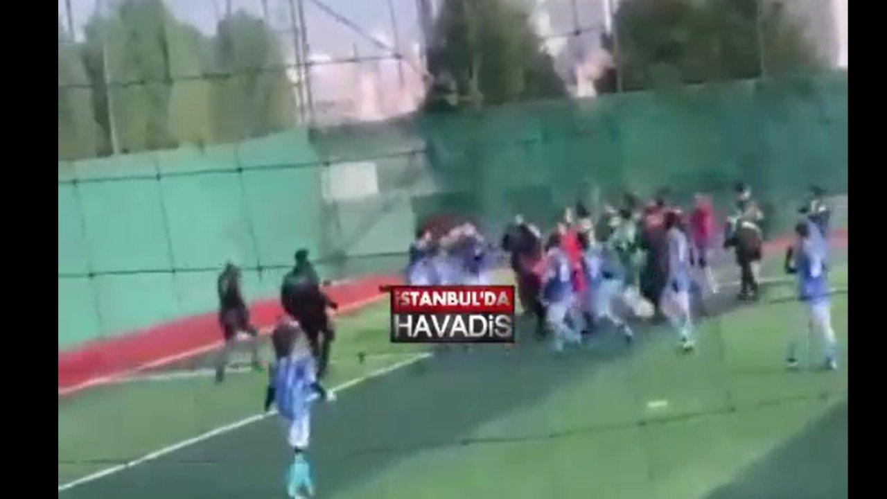 İstanbul’da oynanan bir U14 maçında iki takım birbirine girdi. Antrenörlerin de dahil olduğu kavga tribünlerden anbean görüntülendi.
