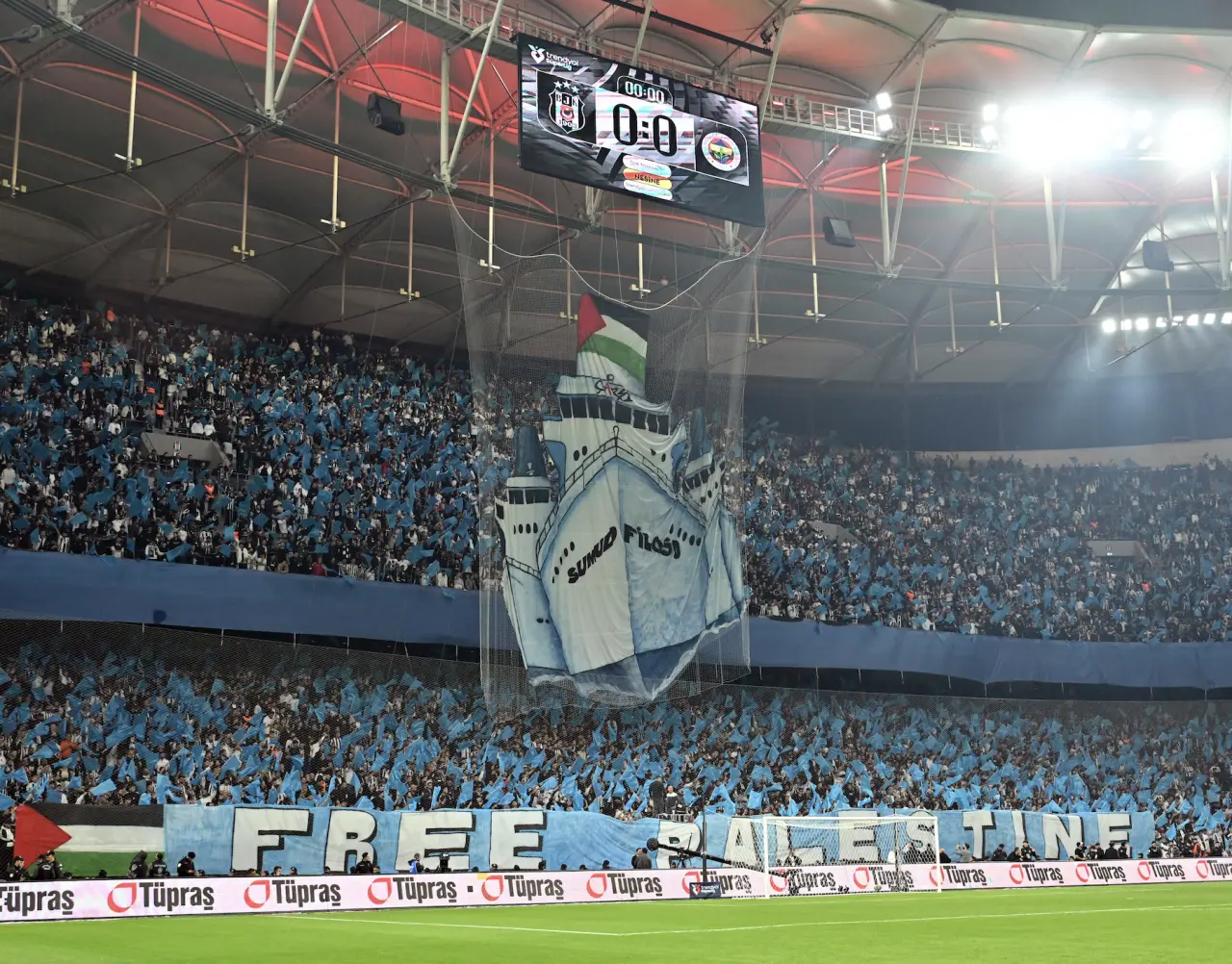 Trendyol Süper Lig'in dev derbilerinden Beşiktaş - Fenerbahçe karşılaşması öncesinde, kale arkası tribünde devasa boyutlarda açılan koreografinin merkezinde, Filistin bayrağını taşıyan bir gemi figürü yer aldı. Bu figürün üzerinde ise "Sumud Filosu" (Filistin direnişindeki "sebat" anlamına gelen Arapça kelime) yazısı dikkat çekti.