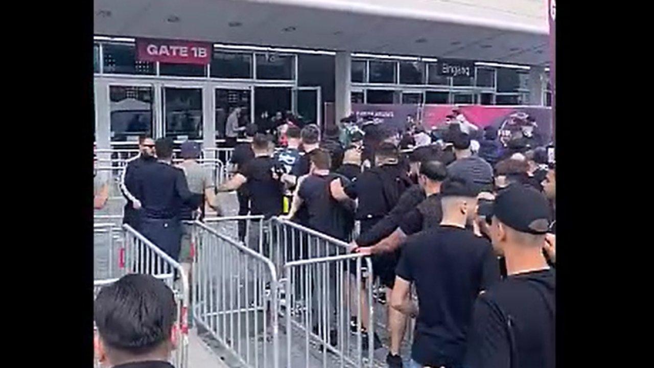 Büyük bir gerginliğe sahne olan anlarda, büyük bir taraftar grubunun hızla salondan içeri doğru koşarak giriş yaptığı görüldü.