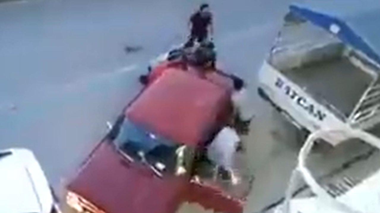 Yol kenarında oturan kişiler bir anda gelip arabayı kaldırarak park yerine elleriyle yerleştiriyor.