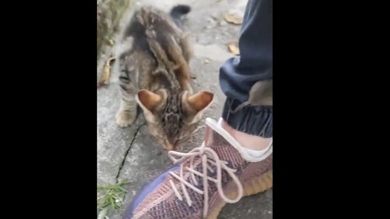 Kedi ile kovalamaca yaşayan minik fare, yoldan geçen bir kişinin paçasına saklanarak kediden kaçmayı başarıyor.