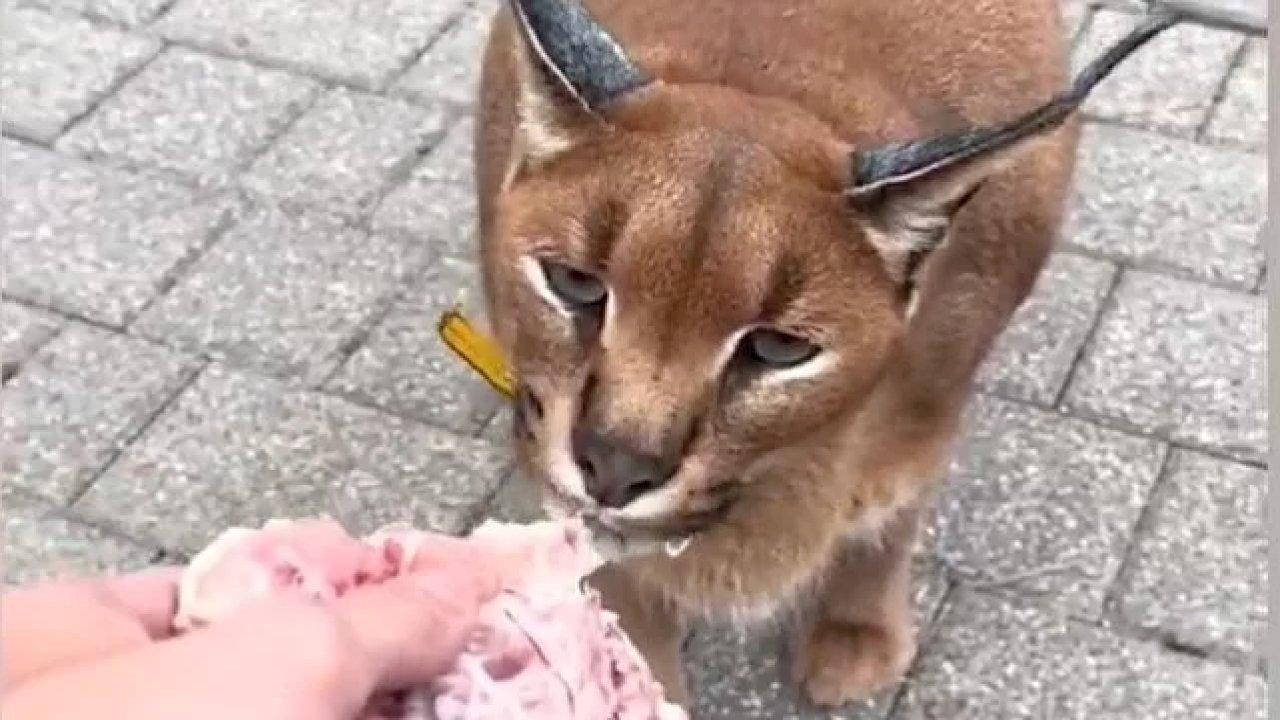 Caracal, diğer adıyla Karakulak'ın sahibi tarafından sevgiyle beslendiği anlar kameraya yansıdı.