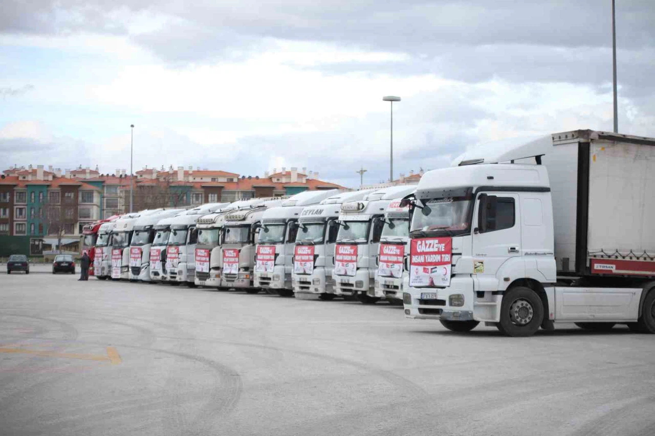 Konya’dan Gazze’ye ulaştırılmak üzere 15 tır insanı yardım malzemesi dualarla yola çıktı.