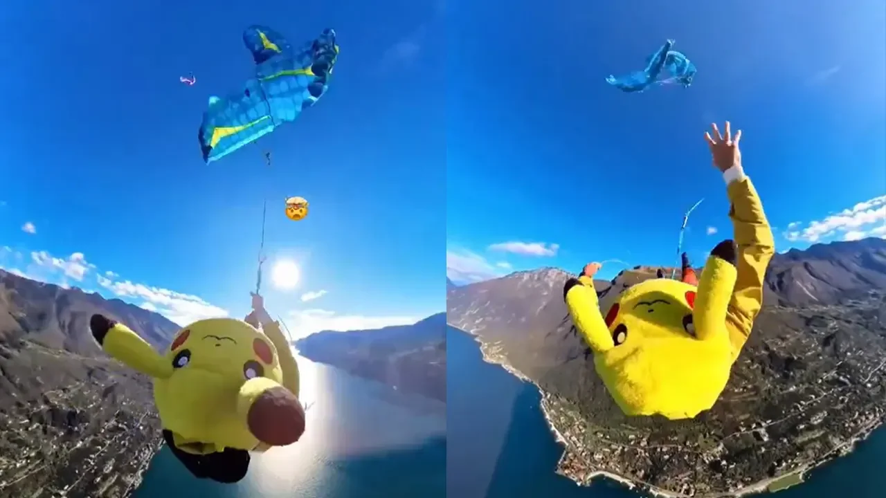 Bir sporcu, yamaç ünlü çizgi film karakteri "Pokemon" kostümü yaparak atlayış gerçekleştirdi. O anlarda kameralar kayıttayken paraşütteki ipler, sporcunun ayağına dolandı.