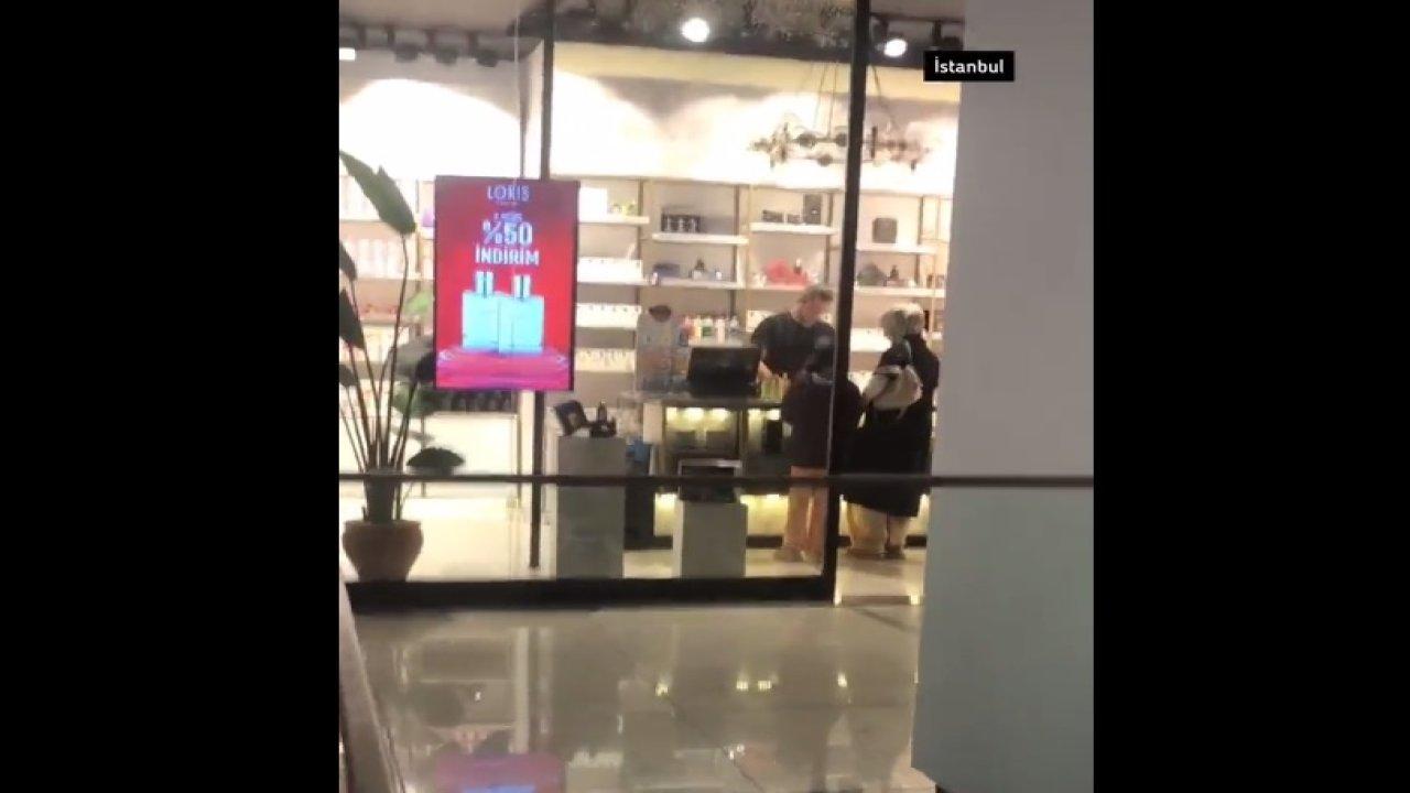 Alışveriş merkezinde mahsur kalan vatandaşların cep telefonu kamerasında yansıyan görüntülerinde, parfüm alışverişi yapan bir kadın gündem oldu.