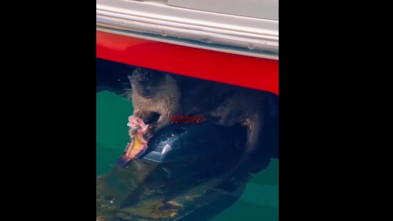 İstanbul Kalamış Marina'da ilginç bir olay yaşandı. Su samuru bir teknenin altında kefal buldu ve karnını doyurdu.
