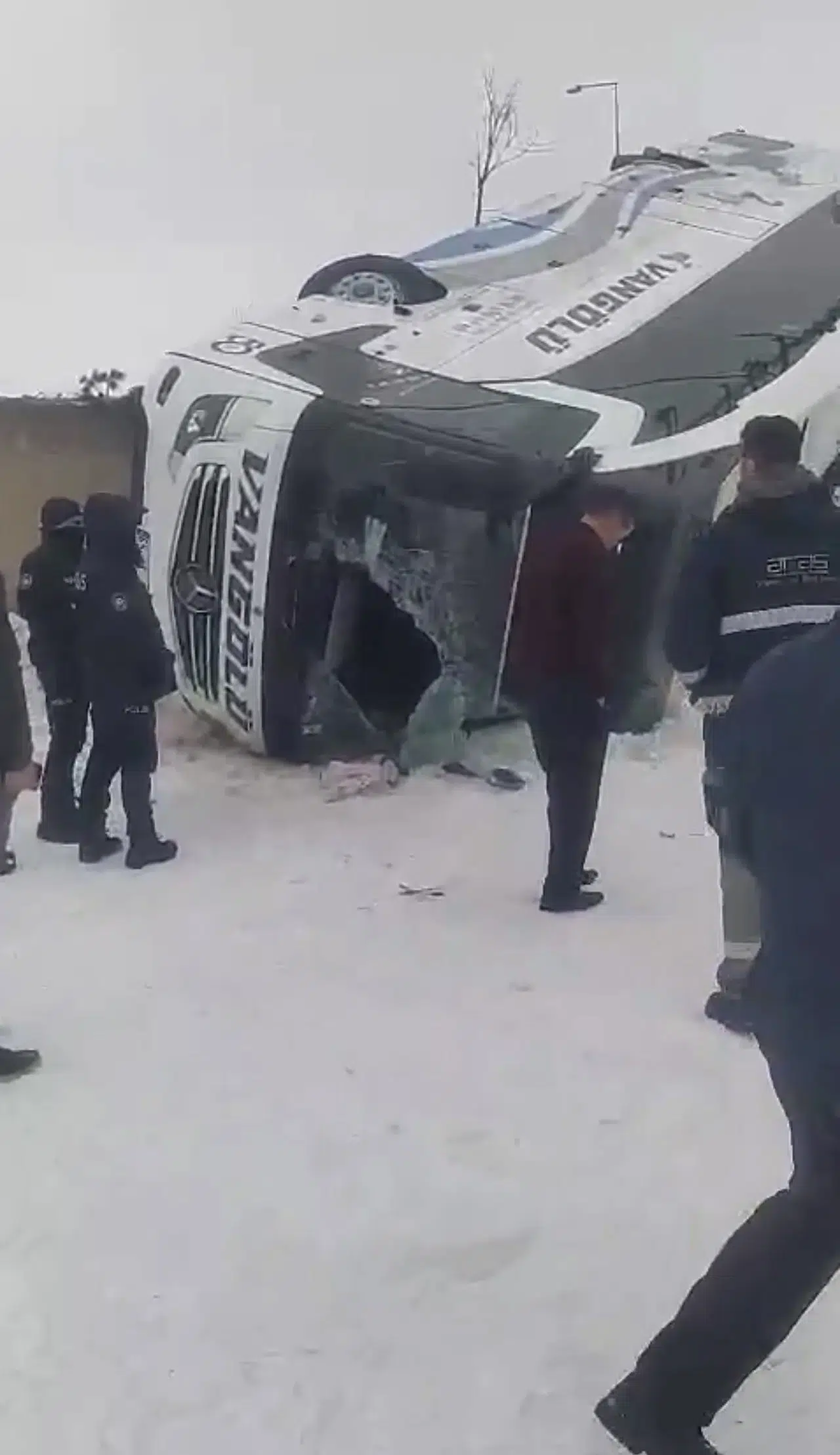 Ağrı’nın Patnos ilçesi sanayi kavşağında, buzlanma nedeniyle kayganlaşan yolda seyir halindeki yolcu otobüsü kontrolden çıkarak devrildi.