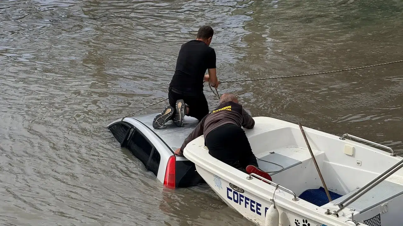 Savrulan otomobil, balıkçı barınağının girişinden Köprüçayı Irmağı’na uçtu. Araç içerisinde bulunan 3 kişi, saniyeler içinde su alan otomobilden kendi imkanlarıyla çıkmayı başardı.