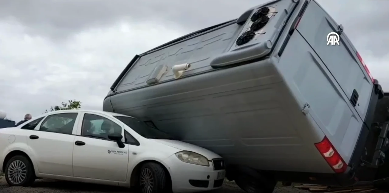 Mobilya atölyesinin bahçesinde yer alan üçgen ev yaklaşık 20 metre sürüklenerek parçalandı. Hortumun etkisiyle çevredeki araçlar savruldu, bazıları ağır hasar aldı. Hortum nedeniyle kara yolunda seyir halindeki bir araca da parçalar çarptı. Olayda can kaybı ve yaralanma yaşanmaması sevindirici oldu.