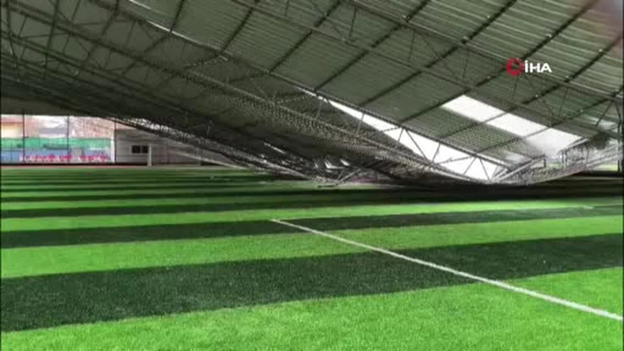 Antalya’da dün akşam fırtına nedeniyle çöken halısahadaki hasar böyle görüntülendi