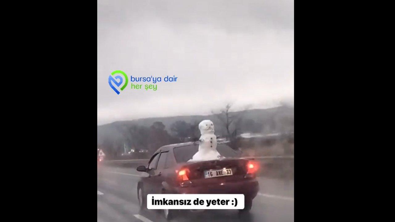 Bursa’da bir vatandaş tarafından cep telefonu kamerası ile görüntülenen anlarda, aracının arkasında bir “kardan adam”la birlikte seyahat eden bir araç sürücüsü yer aldı.