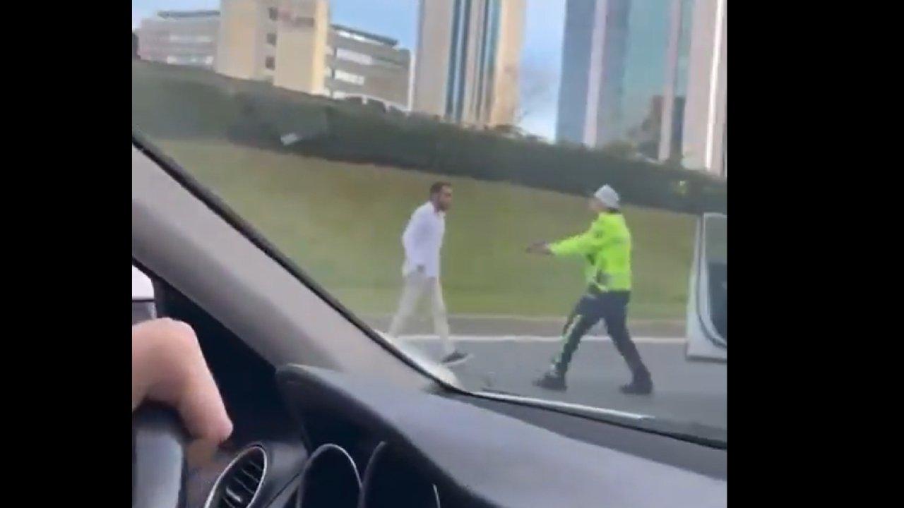 Olay, İstanbul’da bir otoyol üzerinde yaşandı. Trafikte denetim yapan polis memuru bir aracı durdurmak istedi. Durdurulan aracın sürücüsü beklenmedik bir tepki göstererek trafik polisinin üzerine yürümeye başladı.