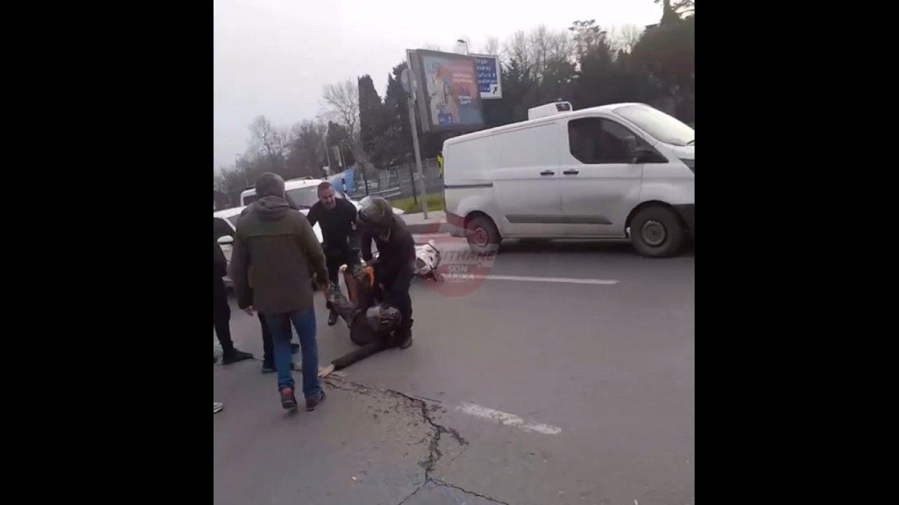 Kazanın etkisiyle devrilen aracıyla birlikte yere savrulan motosikletli adama küfürler yağdırarak dayak atan araç şoförünü araya giren diğer motorcular uzaklaştırdı.