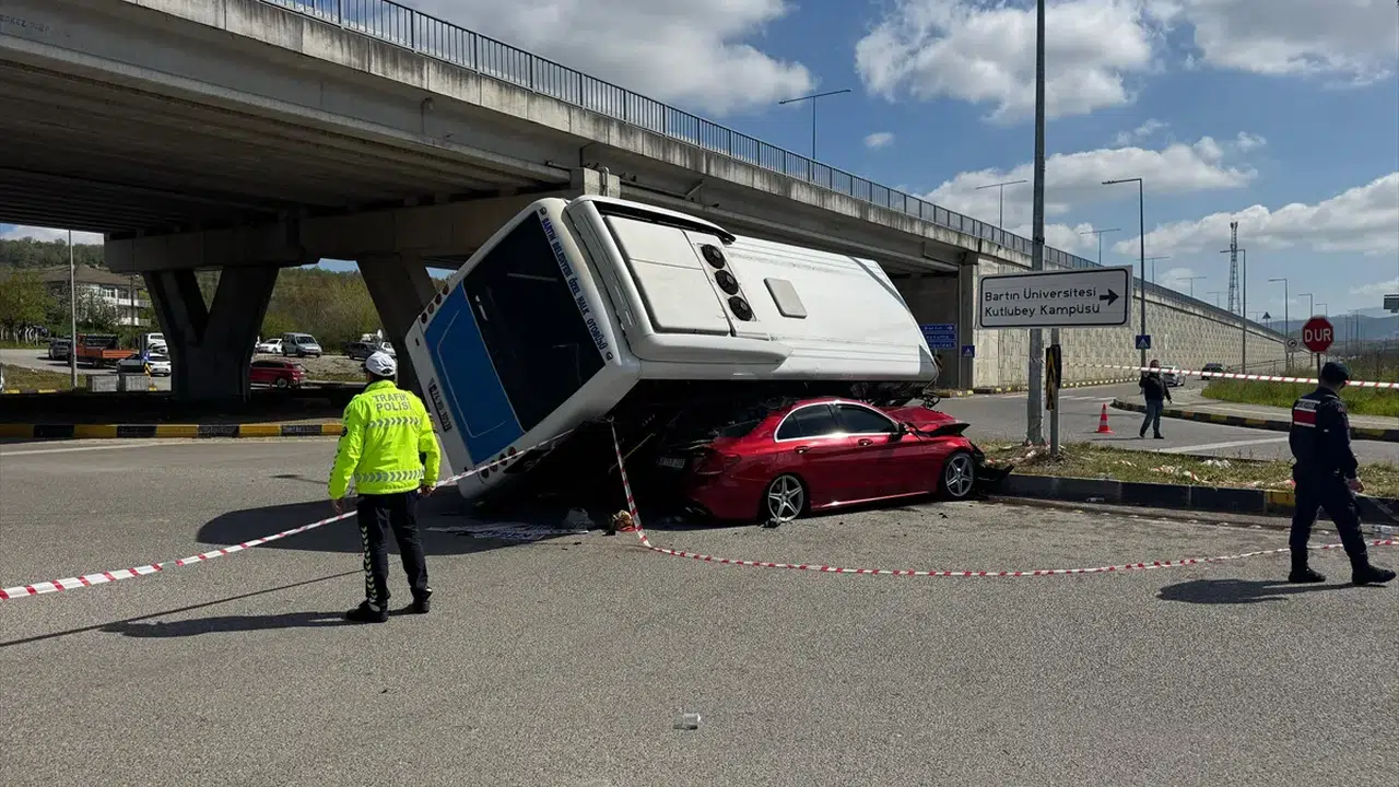 Kent merkezinden Bartın Üniversitesine öğrenci taşıyan H.K. yönetimindeki 74 HO 1053 özel halk otobüsü, Kutlubeyyazcılar kampüsü mevkisinde virajdan dönmek isterken kontrolden çıkıp İ.Ç. idaresindeki 06 FEB 298 plakalı otomobilin üzerine devrildi.