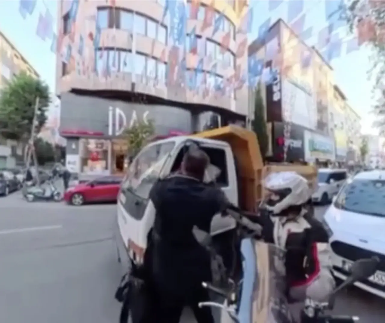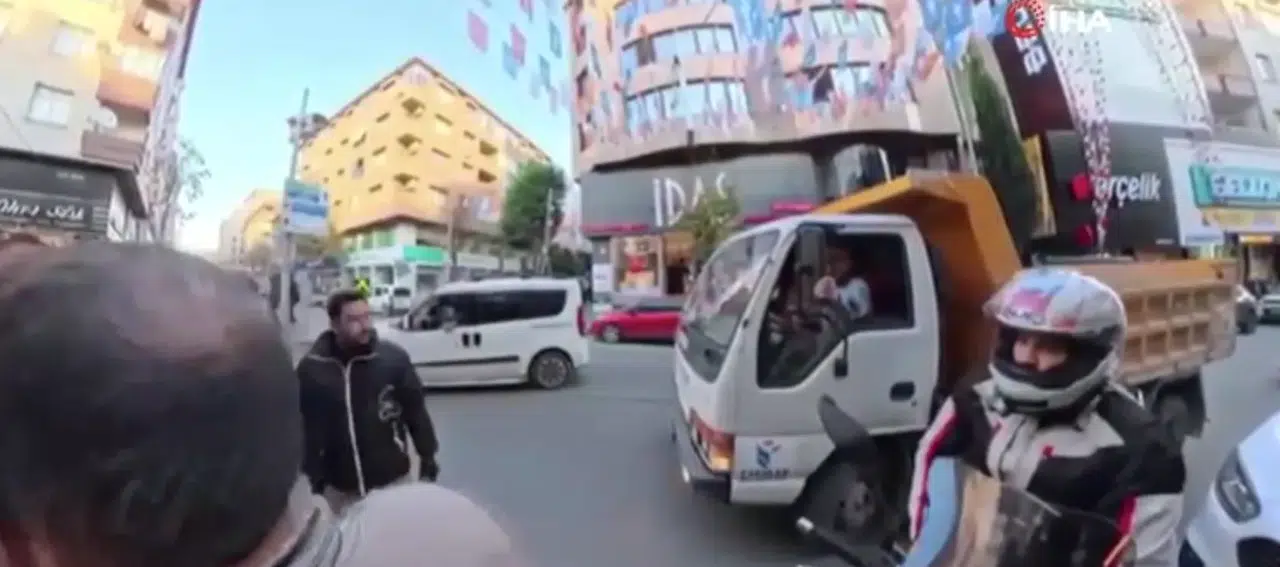 Yaşanan gerginlik, cadde üzerinde seyir halinde bulunan bir motosiklet sürücüsünün kask kamerasına yansıdı. Görüntülerde hem tartışmanın başlangıcı hem de çevredekilerin olaya müdahalesi net şekilde görülüyor.