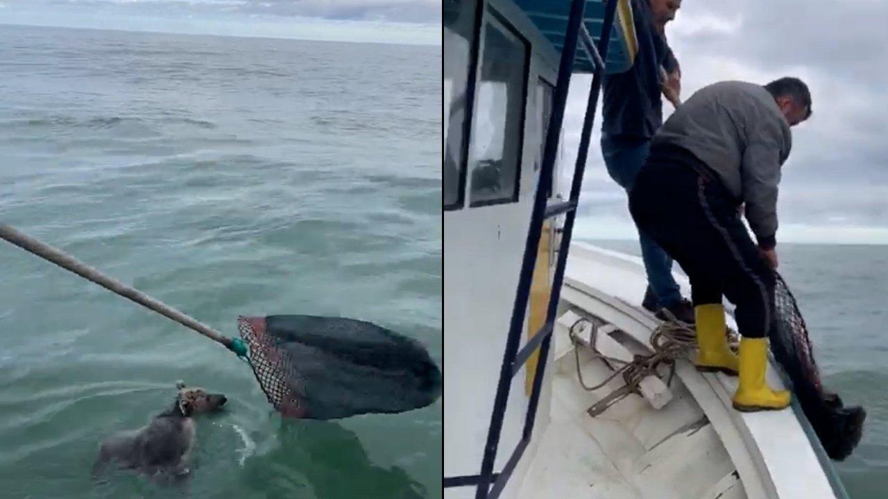 Giresun'un Keşap ilçesinde, denizde mahsur kalan yavru ayı, çevredeki balıkçılar tarafından kurtarıldı. O anlar balıkçıların cep telefonuna yansıdı.