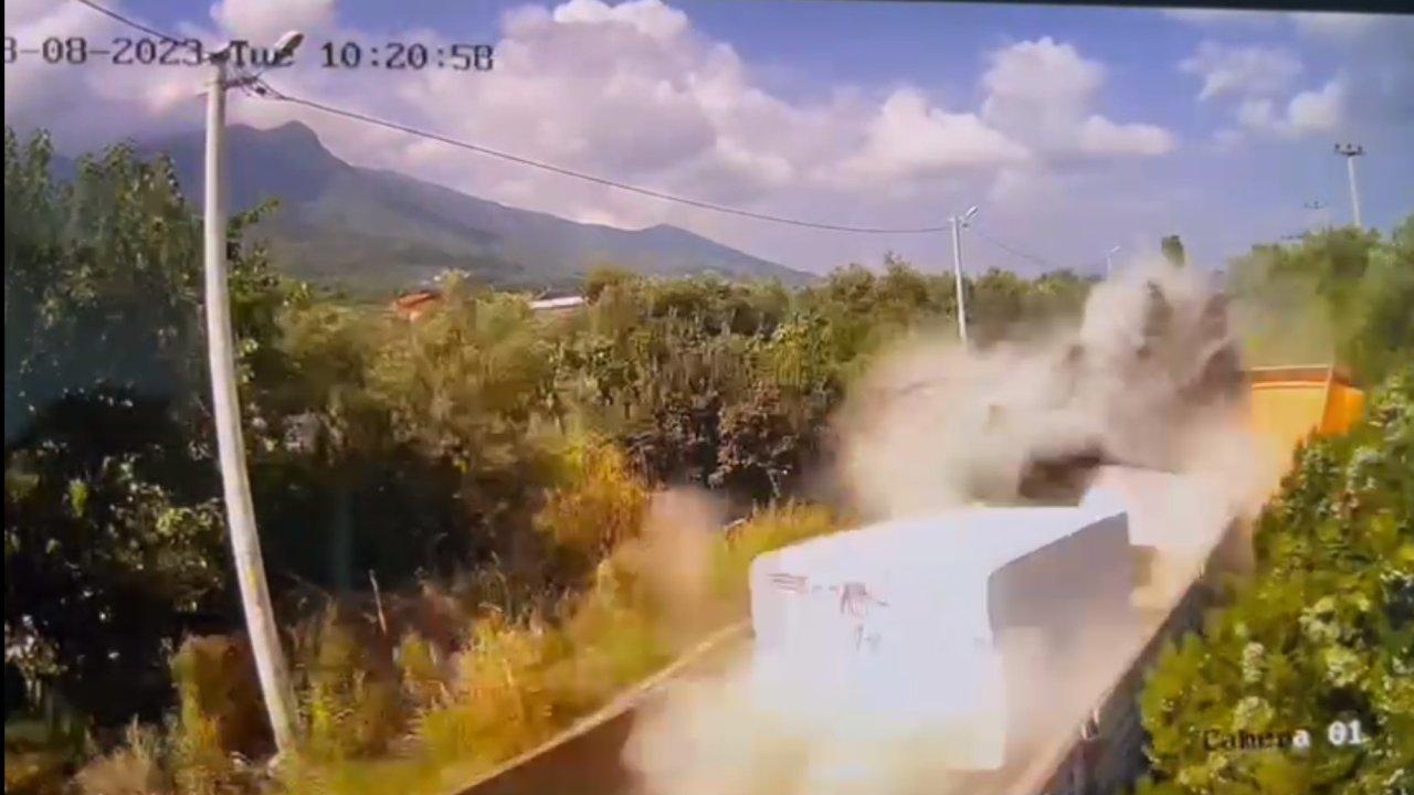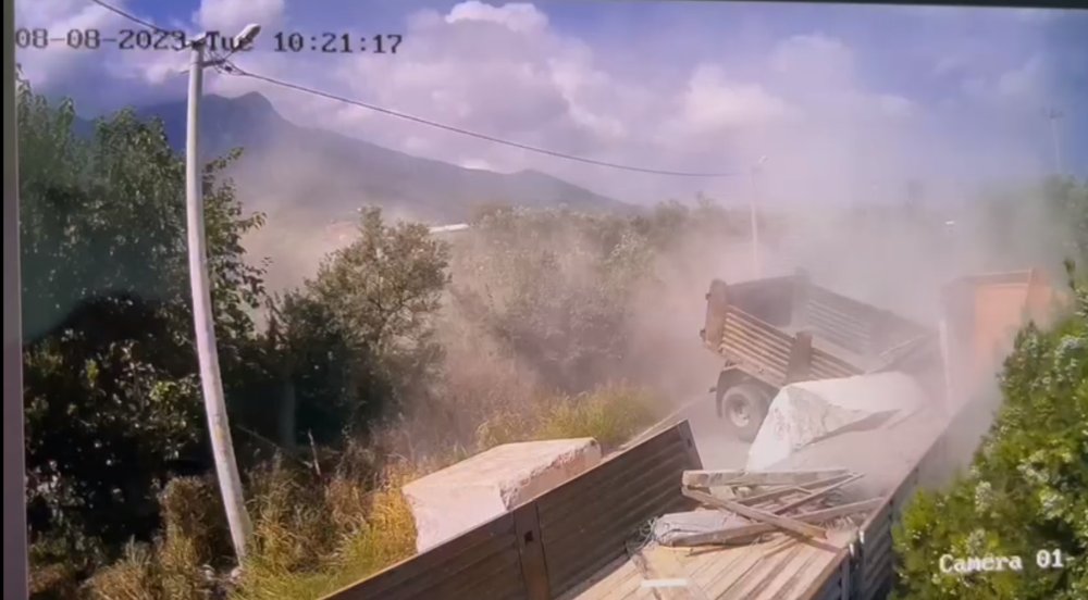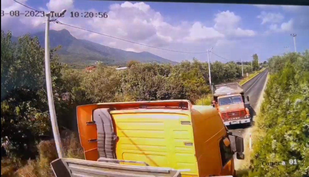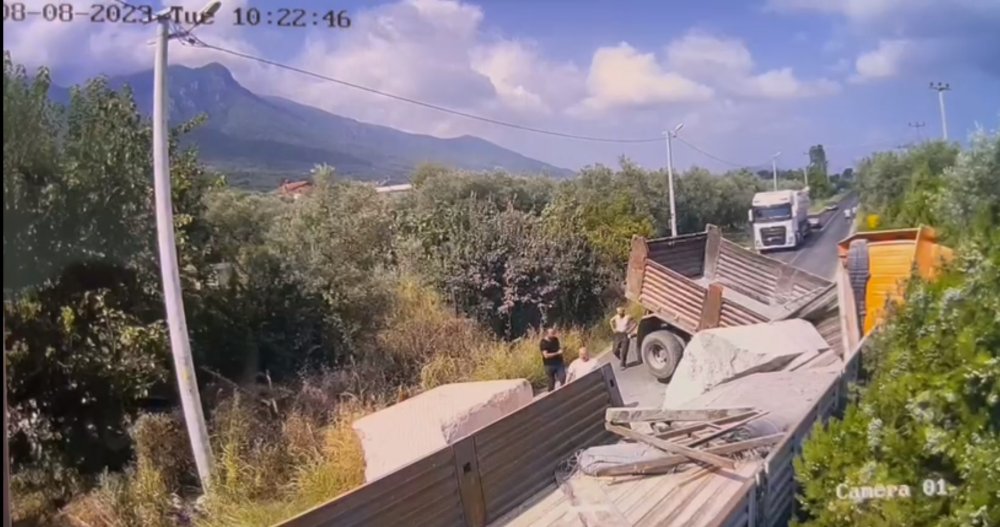 Bursa'nın Orhangazi ilçesinde, kum yüklü kamyon ile mermer blok yüklü TIR'ın çarpıştığı, araçlarında sıkışan şoförler Turgut Akpınar (63) ile Hakan Özcan'ın (33) ağır yaralandığı kazanın güvenlik kamerası görüntüsü ortaya çıktı. Görüntülerde kum yüklü kamyonun, sürücüsünün direksiyon hakimiyetini kaybetmesi sonucu şerit değiştirdiği ve karşı istikametten gelen TIR ile çarpıştığı görüldü. Çarpışmanın şiddetiyle havaya toz bulutu yükselirken, TIR'ın dorsesinde bulunan mermer bloklar ise yola düştü.