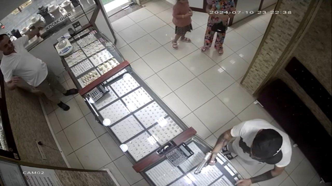 2 çocukla birlikte kuyumcuya giren hırsız, silahını çekerek iş yeri çalışanını tehdit etti.