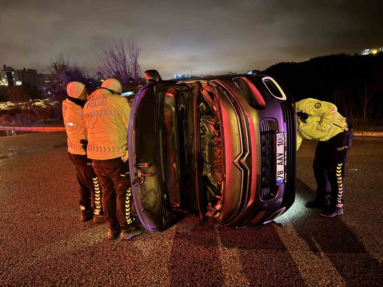 Kaza 100. Yıl Mahallesi 1010 Nolu Sokak’ta meydana geldi. Kimliği belirlenemeyen sürücü idaresindeki 78 AAV 106 plakalı hafif ticari araç Safranbolu istikametine seyir halindeyken kaldırıma çarpıp yaklaşık 50 metre ilerledikten sonra devrildi. Kazada araçta bulunan Ezgi Ç. yaralandı.