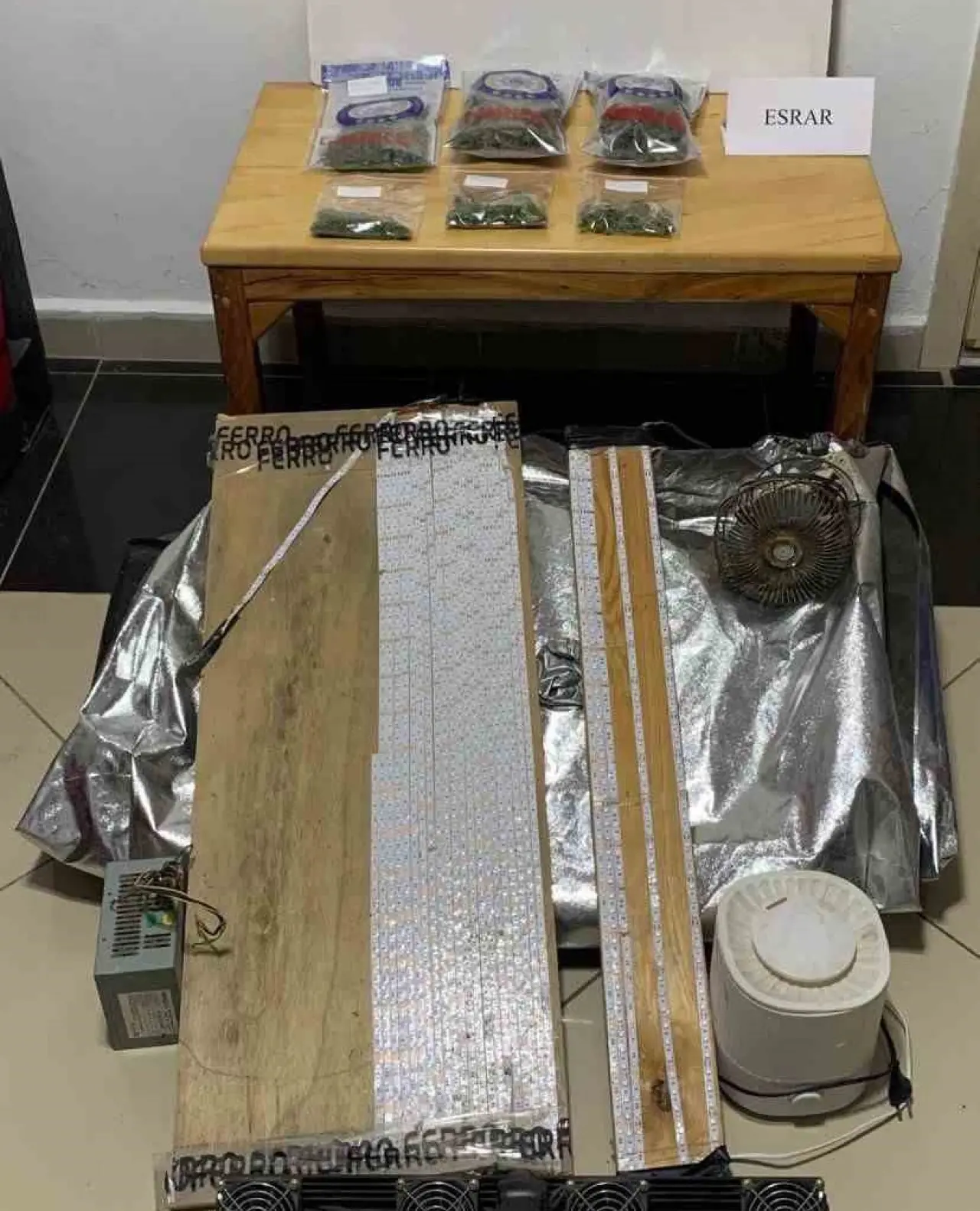 Bu incelemede 145,69 gram esrar ile uyuşturucu yetiştirmeye yönelik ısı ve ışık sistemleriyle hazırlanmış iklimlendirme düzeneği ele geçirildi.