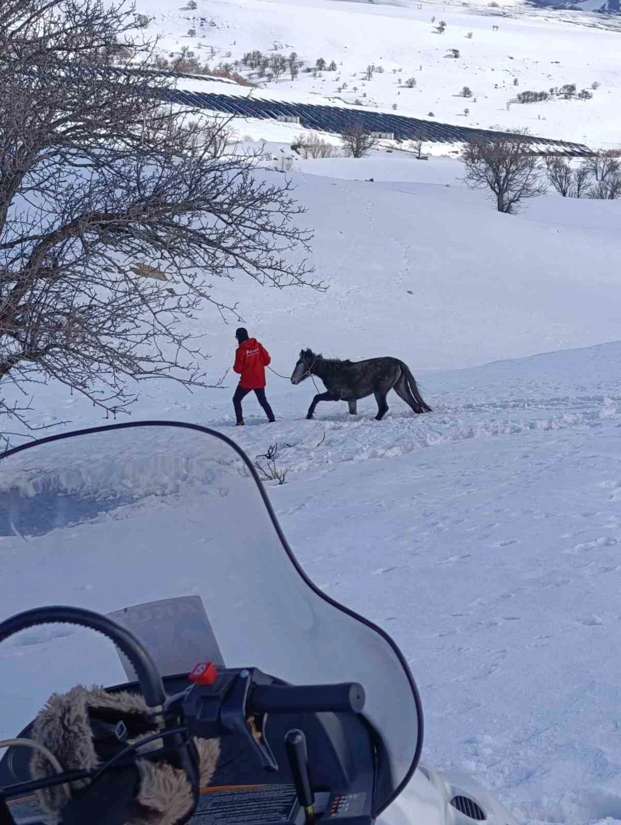 Ardından kar motoru ile ilerlenerek atın mahsur kaldığı bölgeye varıldı. Yer yer 1 metreyi bulan kar kalınlığı ve engebeli arazi şartlarına rağmen ekip, yaklaşık bir saat süren zorlu bir mücadelenin ardından yaralı atı bulunduğu noktadan alarak yürütmek suretiyle köy yoluna ulaştırdı.