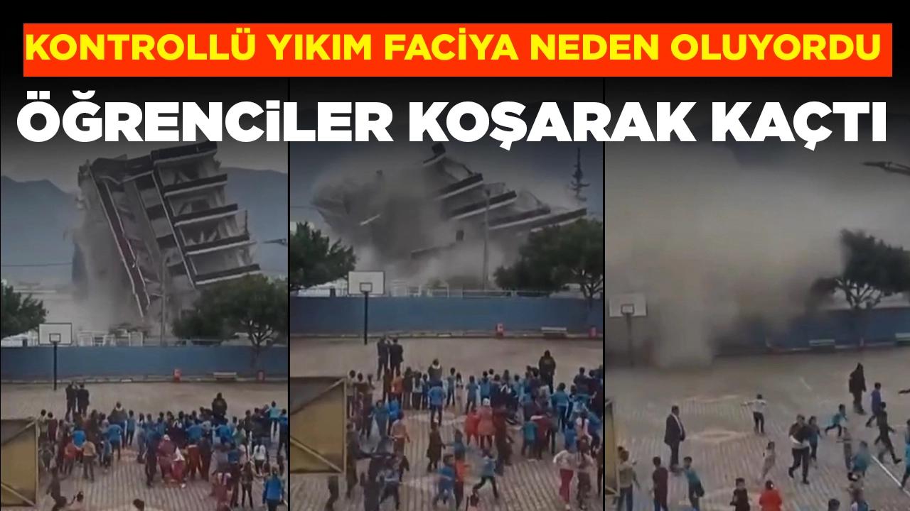 Hatay'ın İskenderun ilçesinde bir ilkokulun yanındaki ağır hasarlı binanın kontrollü yıkımı sırasında oluşan toz bulutu ve etrafa saçılan parçalar nedeniyle bahçedeki öğrenciler koşarak kaçtı.