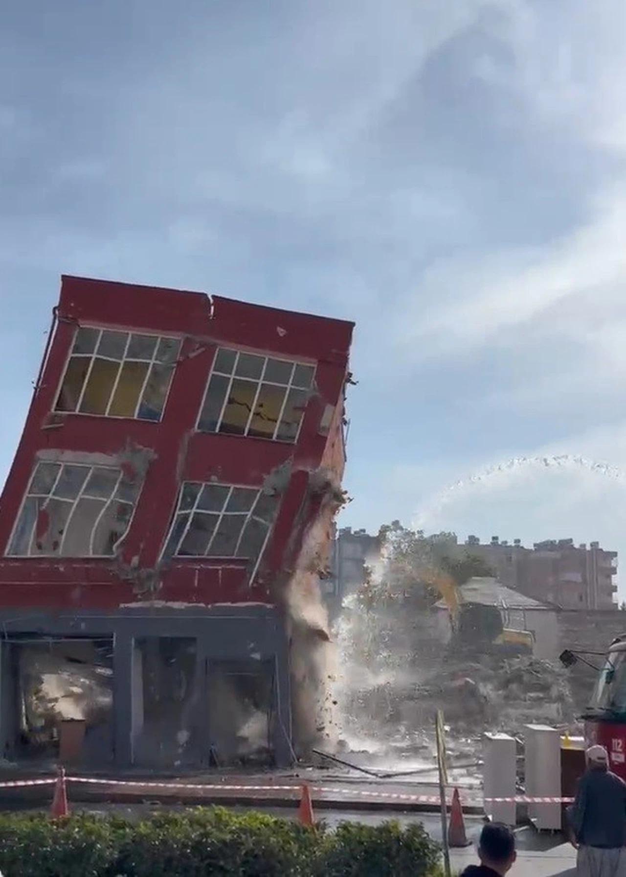 O anlar cep telefonu kamerasına yansırken, yıkım sırasında oluşan toz bulutuna karşı itfaiye ekipleri bölgede sulama yaptı.