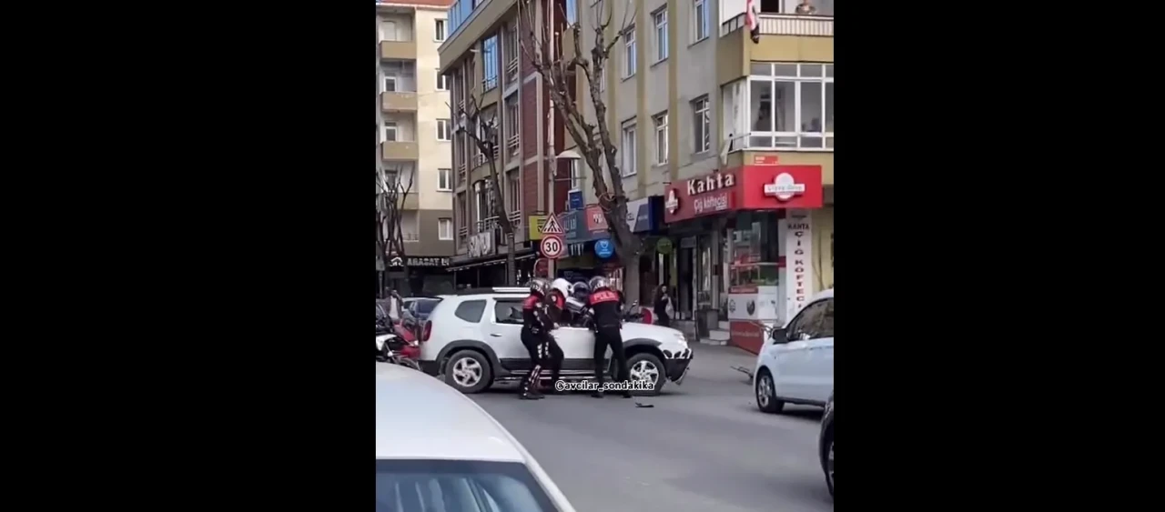 İstanbul Avcılar'da polisin dur ihtarına uymayan şüpheli araç, polislerin uzun uğraşları sonucu Avcılar Reşitpaşa Caddesi'nde sıkıştırılarak durduruldu. Olay anını görüntüleyen vatandaşın kamerasına yansıyan görüntülerde dört yunus polisin şüpheliyi/şüphelileri durdurmak için verdiği mücadele kamera kaydına yansıdı.