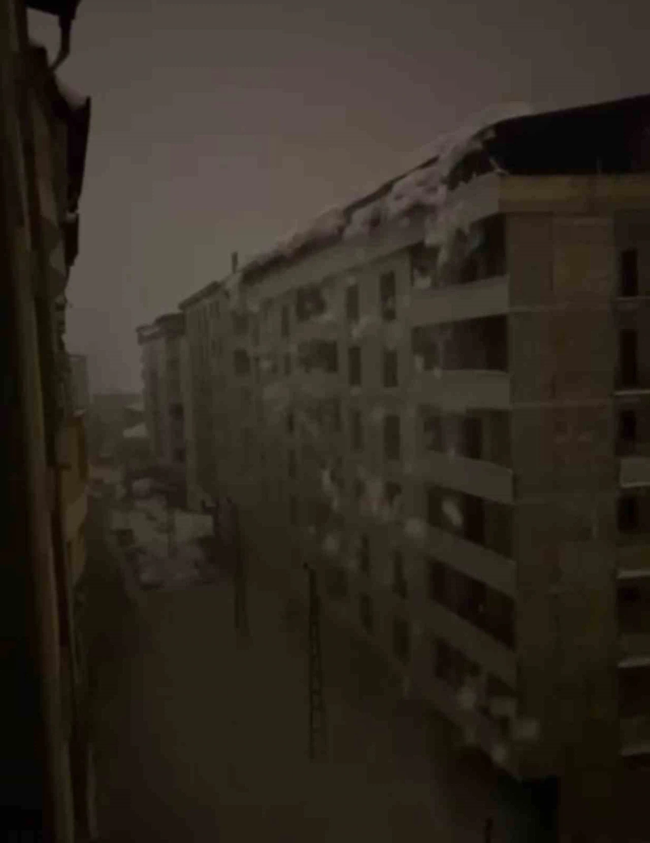 Binanın önünde bulunan elektrik direklerinin üzerine düşen kar kütlesi, enerji hatlarını kopardı. Mahallenin tamamında elektrik kesintisi yaşanırken, olay saniye saniye güvenlik kamerasına yansıdı. Görüntülerde kar kütlesinin düşmesiyle beton direklerin adeta bir kağıt gibi ezildiği ve çevreyi kar tozunun kapladığı görüldü.