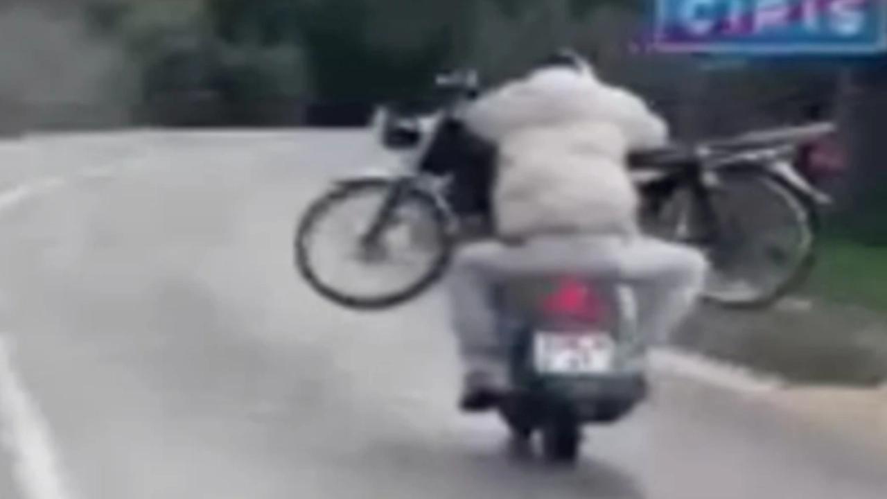 Görüntülerde, seyir halindeki motosiklete 2 kişinin bindiği, aralarına arızalı olduğu tahmin edilen motosiklet koyup, yolculuk yaptıkları görüldü.