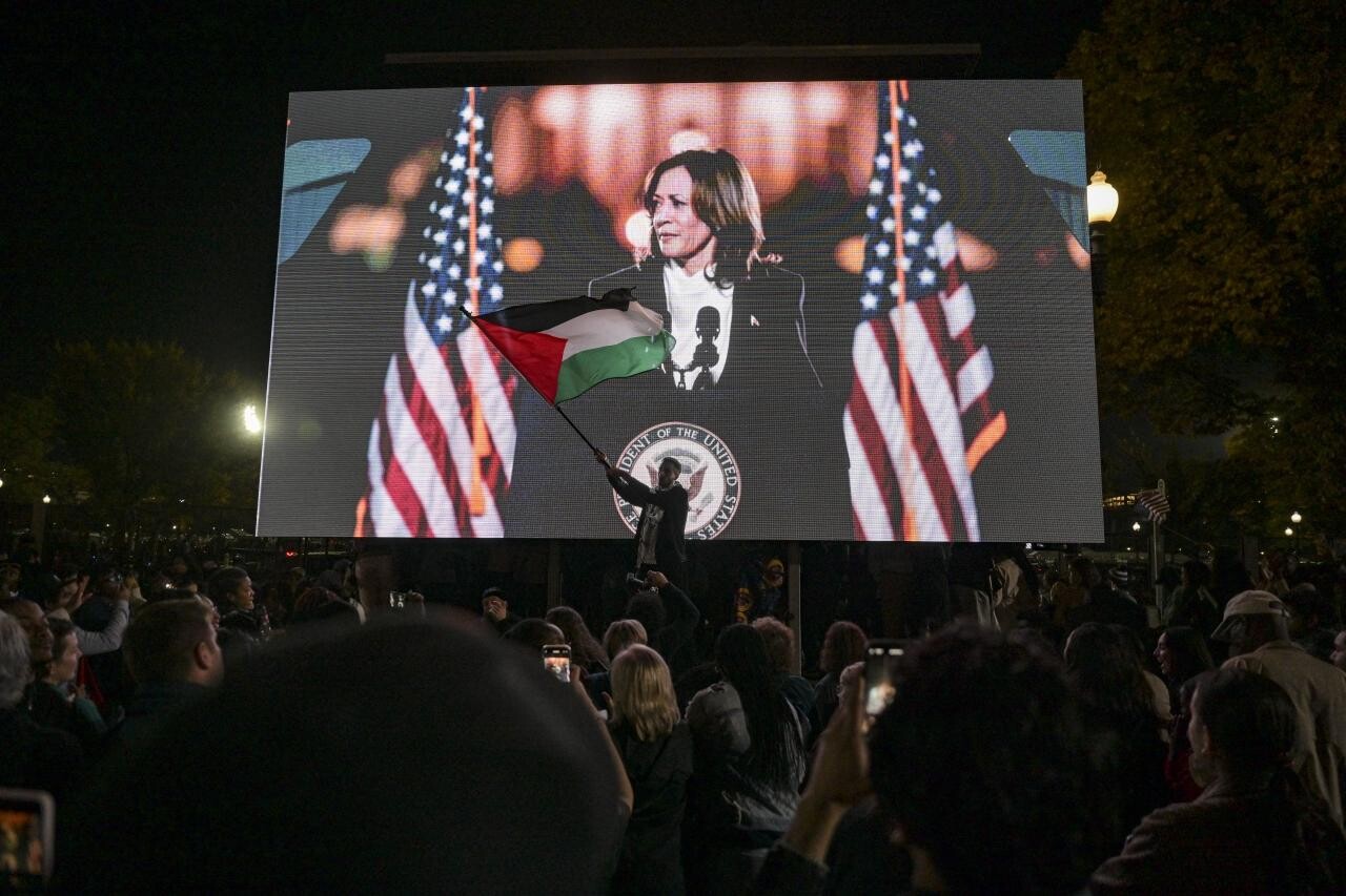 Harris'in konuşmasına devam ettiği sırada yaklaşık 300 kişiden oluşan kalabalık grup, Filistin ve Gazze lehine sloganlar attı ve Biden-Harris yönetimini protesto etti.