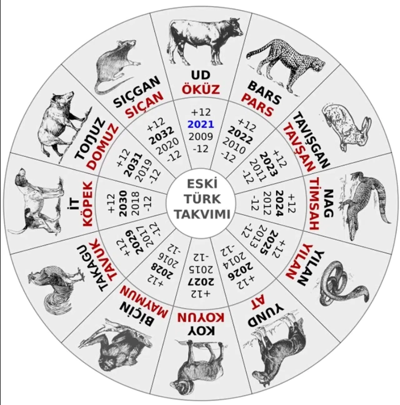 Yıl döngüsü 12 yıldır ve her yıl bir hayvan adıyla anılır.