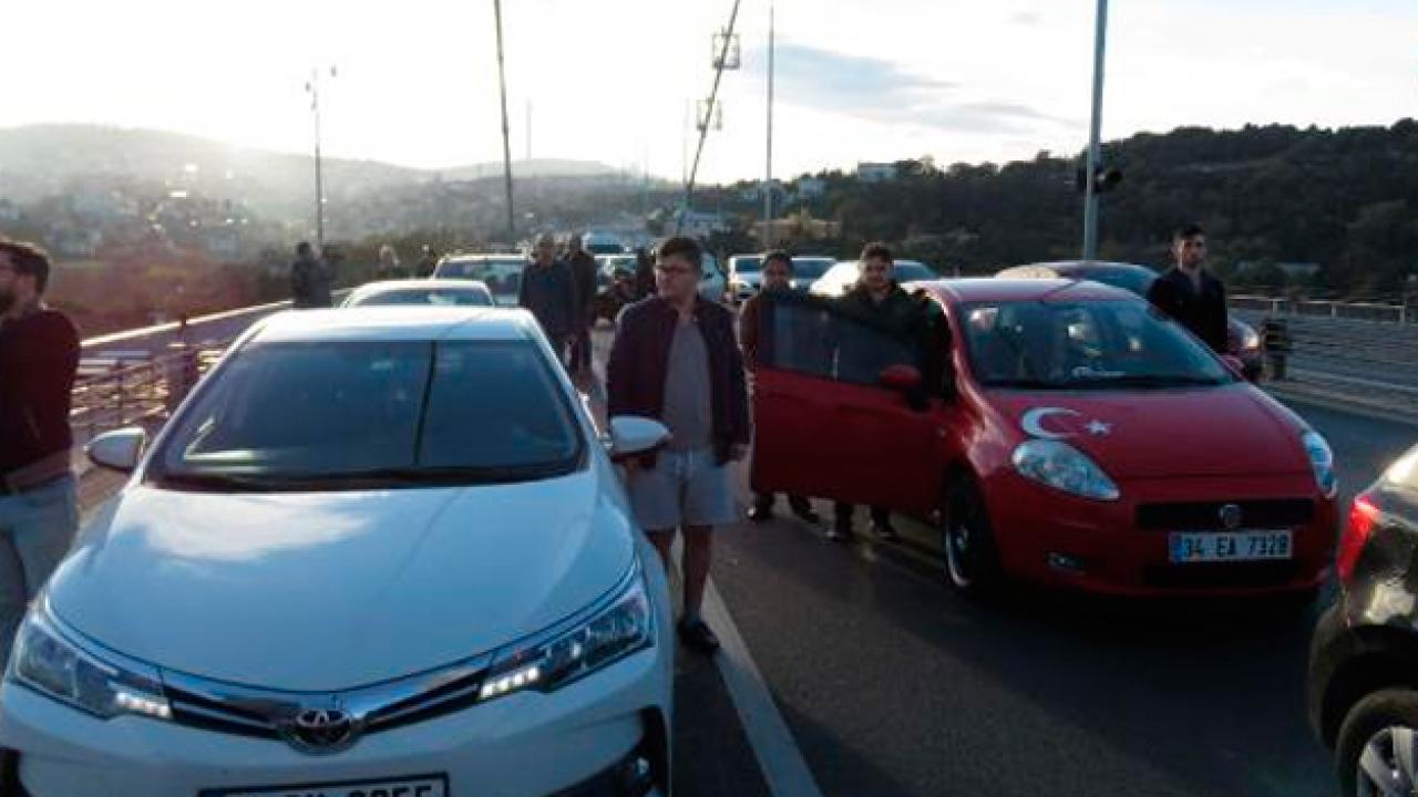 15 Temmuz Şehitler Köprüsü'nde Ata'ya saygı duruşu için sürücüler trafikte araçlarından indi. Saat tam 09.05'i gösterdiğinde saygı duruşuna geçildi.