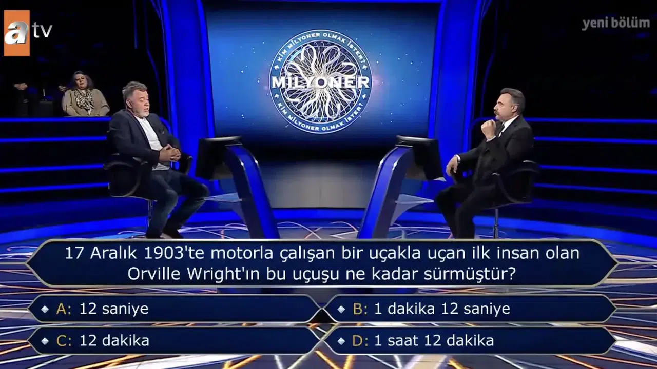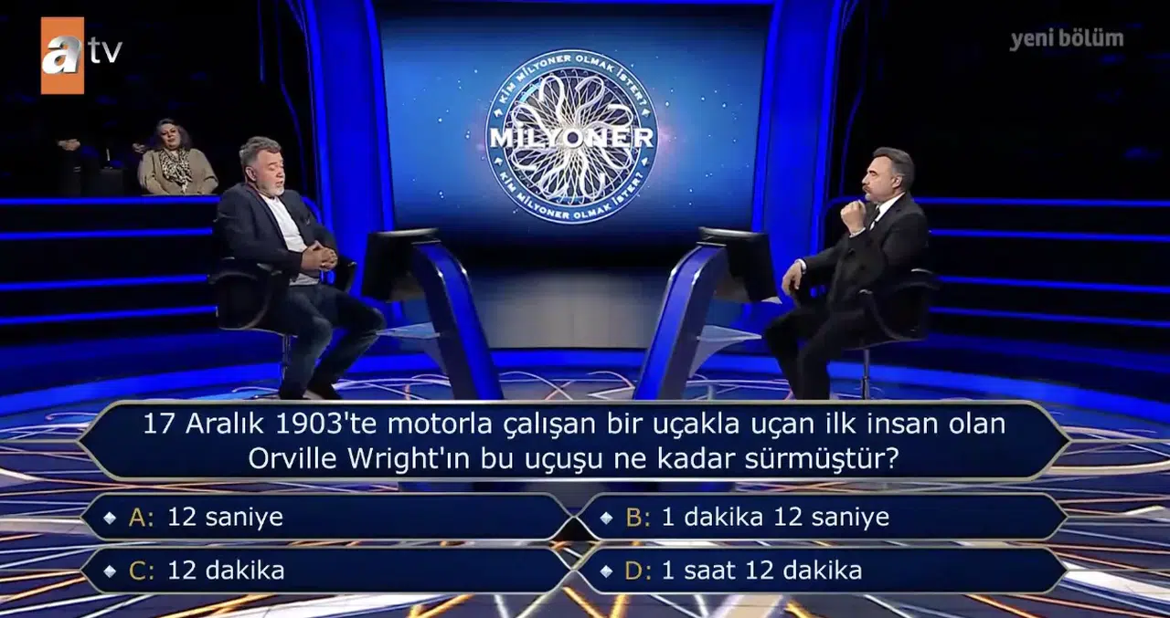 Bilgi yarışmalarında sıkça karşılaşılan tarih ve genel kültür soruları, izleyicilerin hem bilgisini hem de dikkatini ölçmeye devam ediyor. Özellikle havacılık tarihine damga vuran gelişmelerle ilgili sorular, geniş bir kesimin ilgisini çekiyor. “17 Aralık 1903’te motorla çalışan uçakla uçan ilk insan Orville Wright’ın bu uçuşu ne kadar sürmüştür?” sorusu da son dönemde en çok araştırılan başlıklar arasında yer aldı.