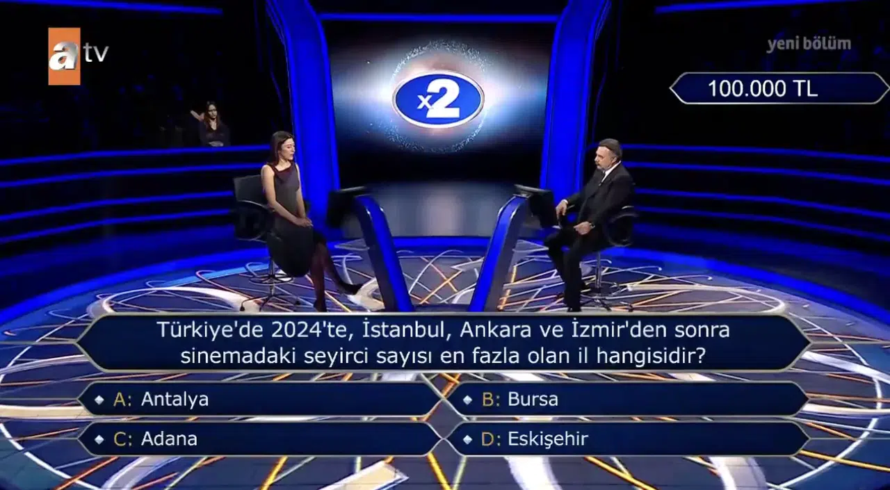 ATV’de Oktay Kaynarca’nın sunumuyla ekrana gelen Kim Milyoner Olmak İster yarışmasında bu hafta sinema izleyici sayıları sorusu dikkat çekti. İstanbul, Ankara ve İzmir’den sonra seyirci sayısı en fazla olan il üzerine kurulu bu soru, yarışmacıyı düşündürdüğü gibi izleyenleri de sosyal medyada tartıştırdı. Şıklar arasındaki iller merak uyandırdı.